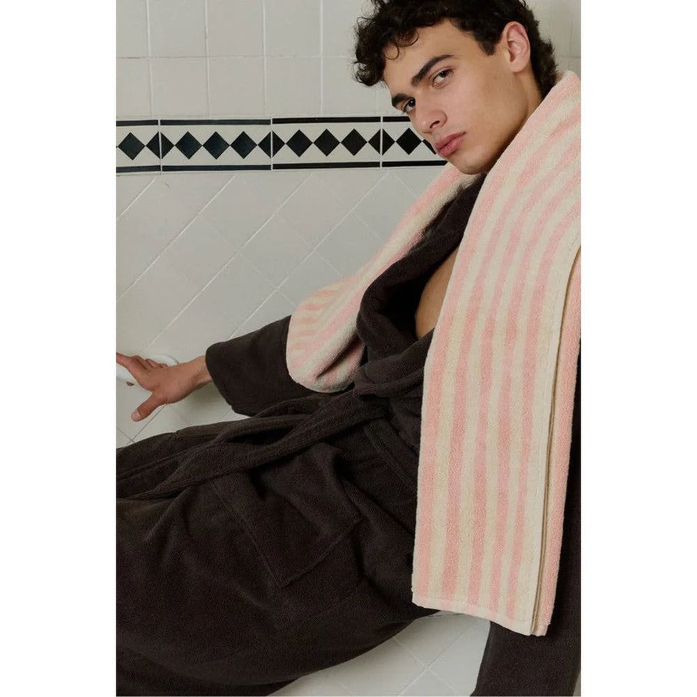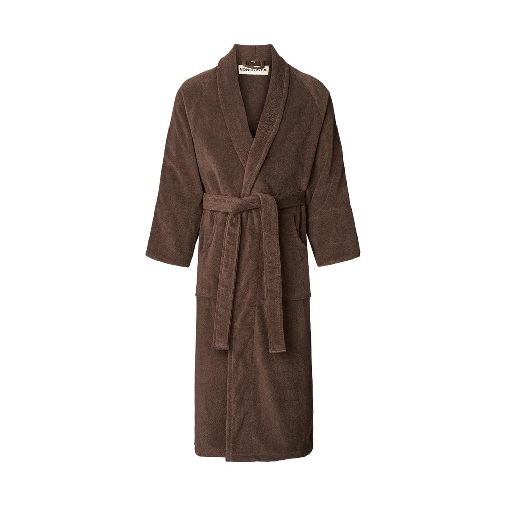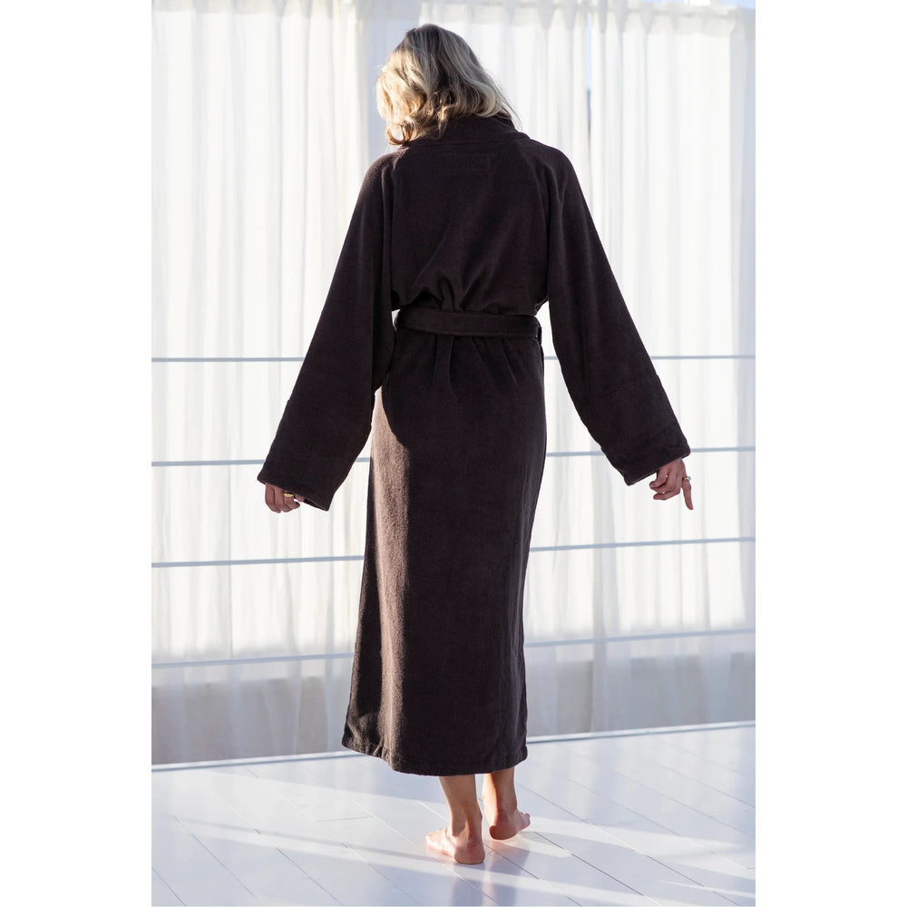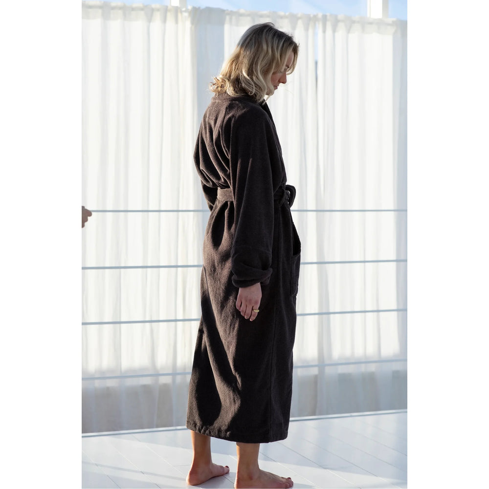 Uniseks kućni ogrtač izrađen od 100% organskog pamuka s OEKO-TEX® Made in Green certifikatom. Klasičan kroj s pojasom, šalom-ovratnikom i velikim džepovima pruža vrhunsku udobnost i mekoću.