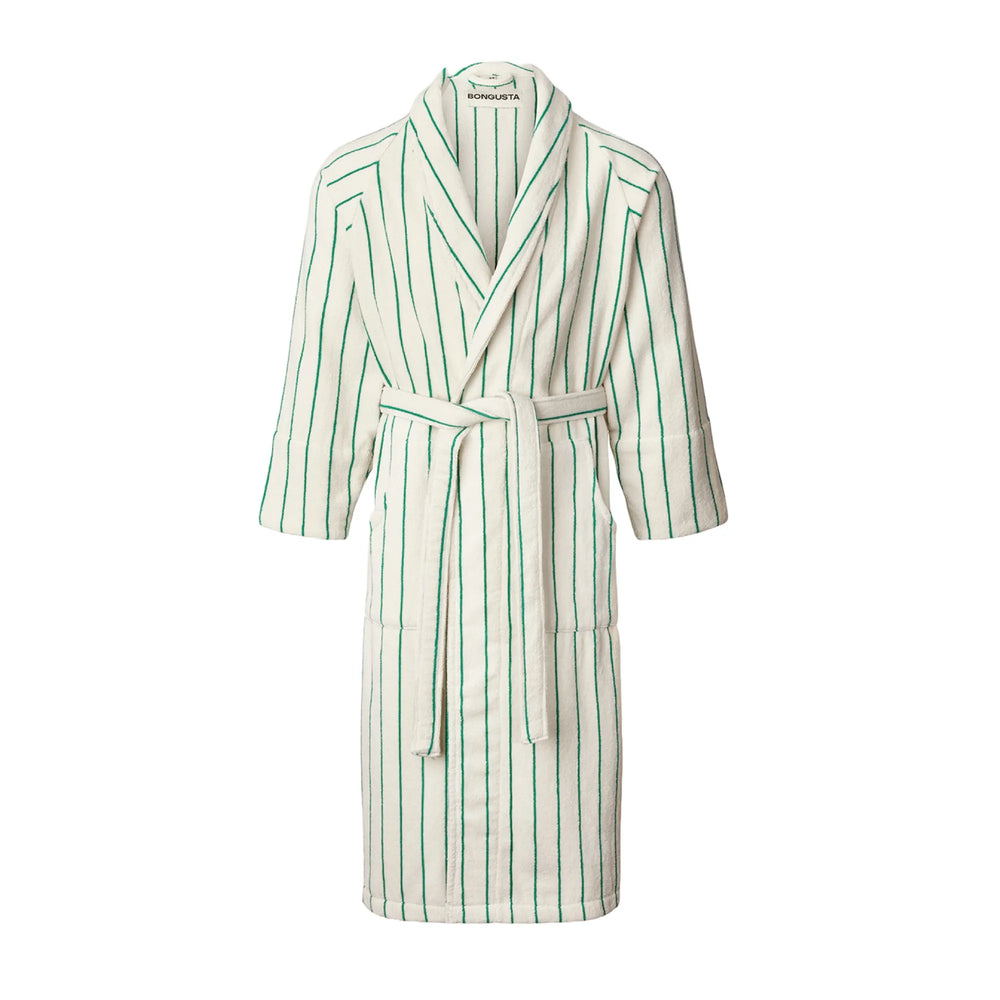 Uniseks kućni ogrtač izrađen od 100% organskog pamuka s OEKO-TEX® Made in Green certifikatom. Klasičan kroj s pojasom, šalom-ovratnikom i velikim džepovima pruža vrhunsku udobnost i mekoću.