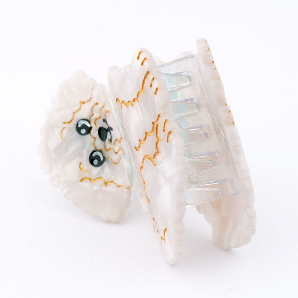 Kopča za kosu u obliku neodoljivog, kovrčavog bišona. Sa svojim sanjivim očima, tirkiznom ogrlicom i zlatnim detaljima, ovaj će pas praviti društvo svakoj frizuri, od neuredne punđe do urednih repića.