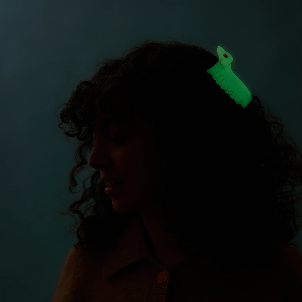 Kopča za kosu u obliku popularnog jazavčara s glow-in-the-dark efektom, dizajnirana kao razigran, ali funkcionalan dodatak za sigurno pričvršćivanje kose.