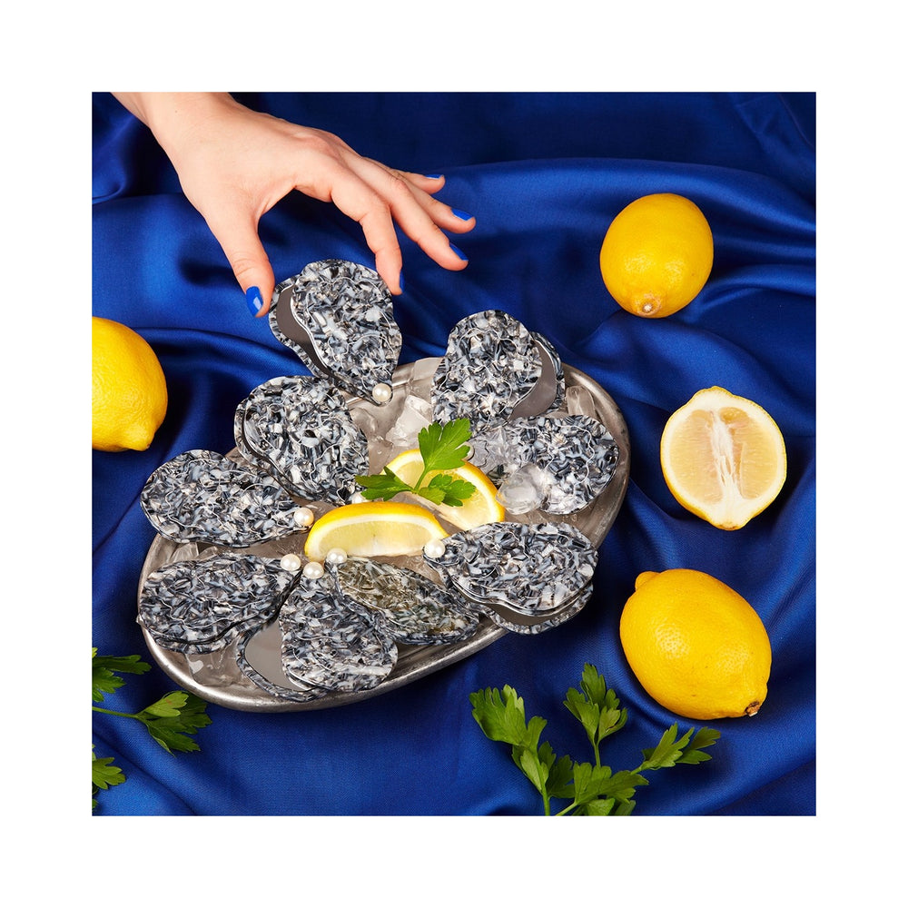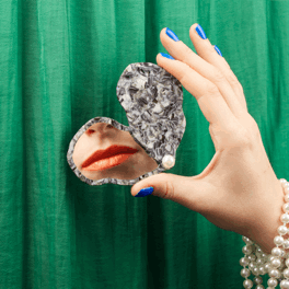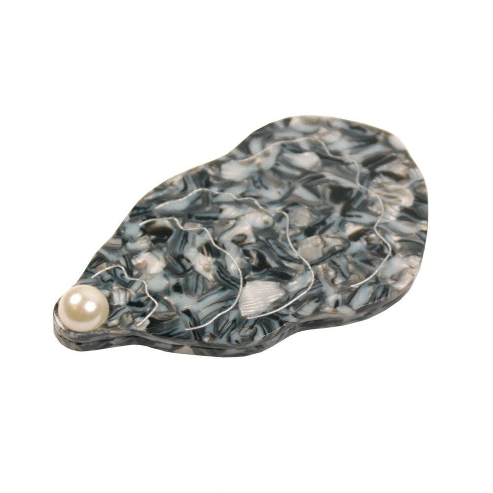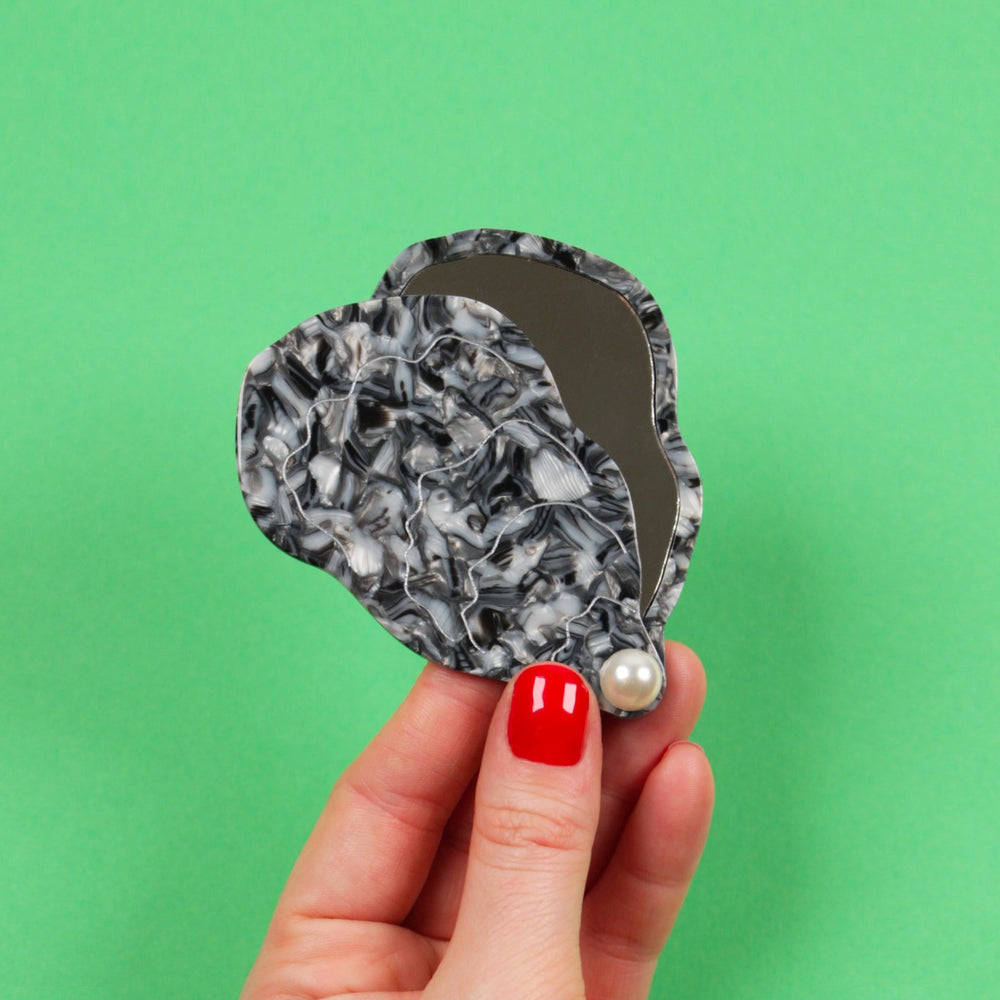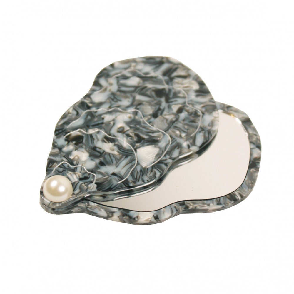Kičasto džepno ogledalo u obliku kamenice s bisernim detaljom za dotjerivanje u hodu.