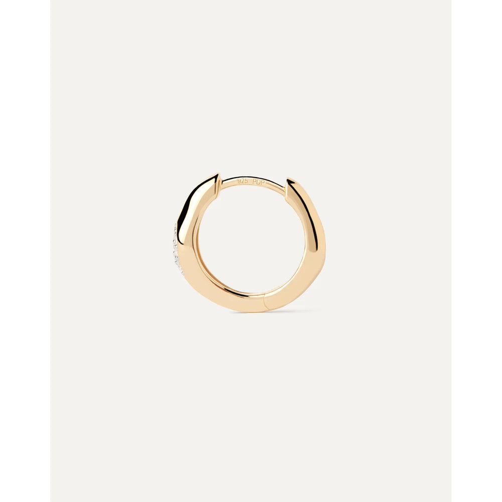 Završna obrada: pozlata od 18k zlata. Materijal: srebro (925). Kamenčići: bijeli cirkoni. Vanjski promjer obruča: 12.8 mm. Unutarnji promjer obruča: 10 mm. Debljina: 3.65 mm. Težina: 2.23 g.