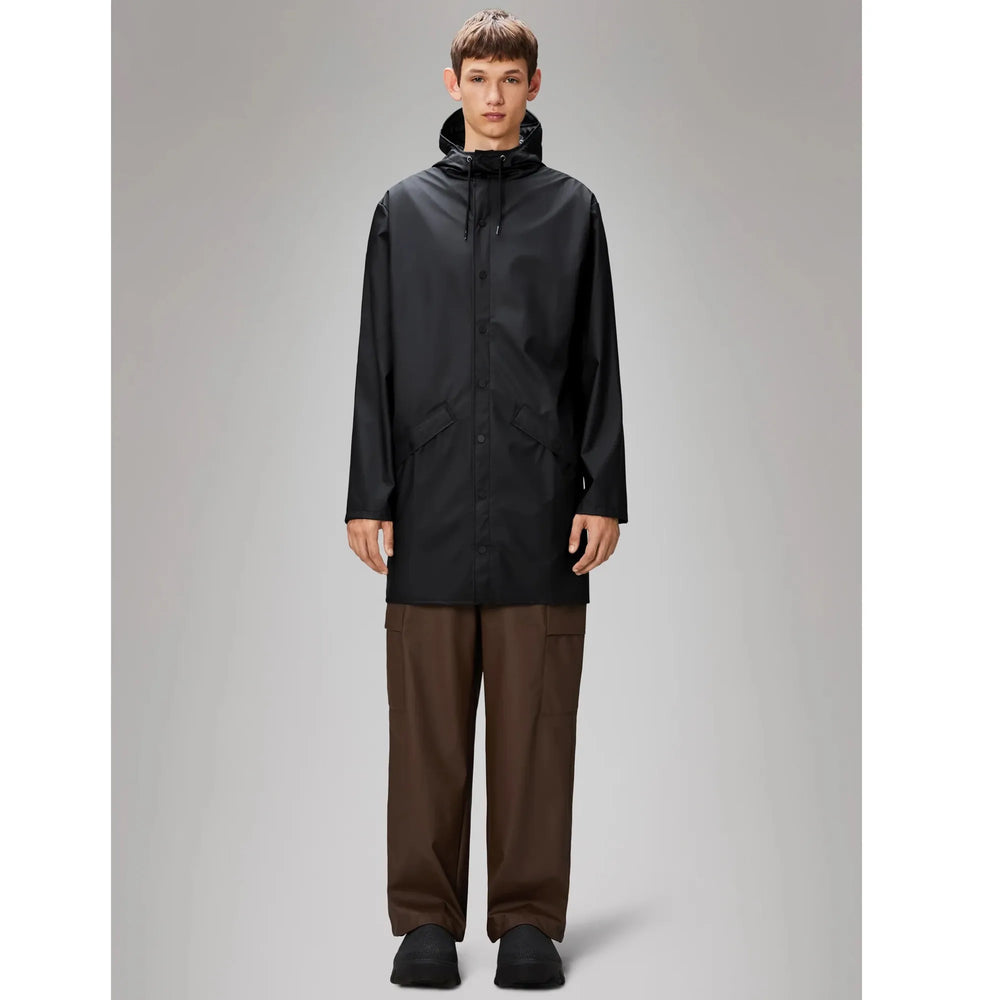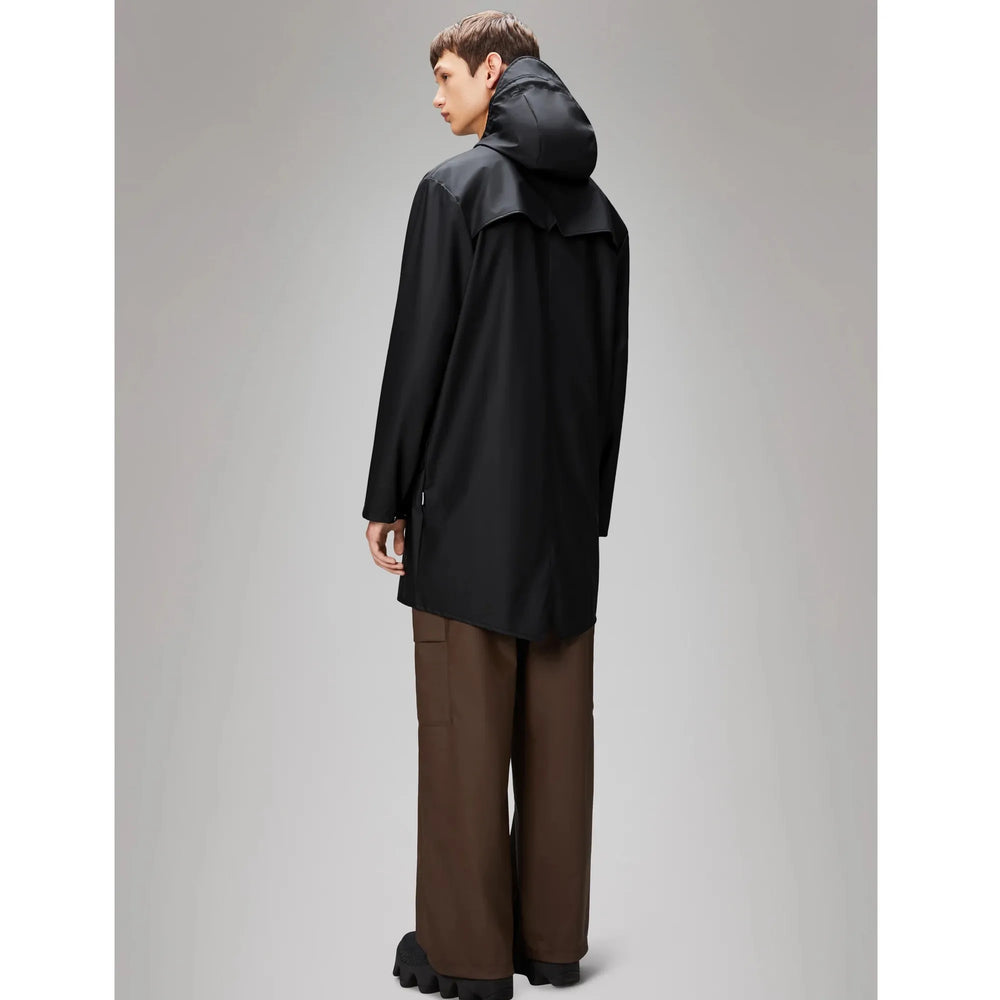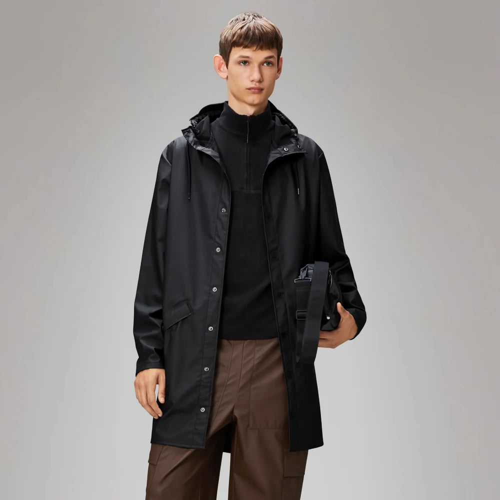 Rains jakna za kišu s kapuljačom pruža visoku funkcionalnost u minimalističkoj silueti. Ima dvostruke kose džepove s preklopom, podesive manžete i porub s ribljim repom.