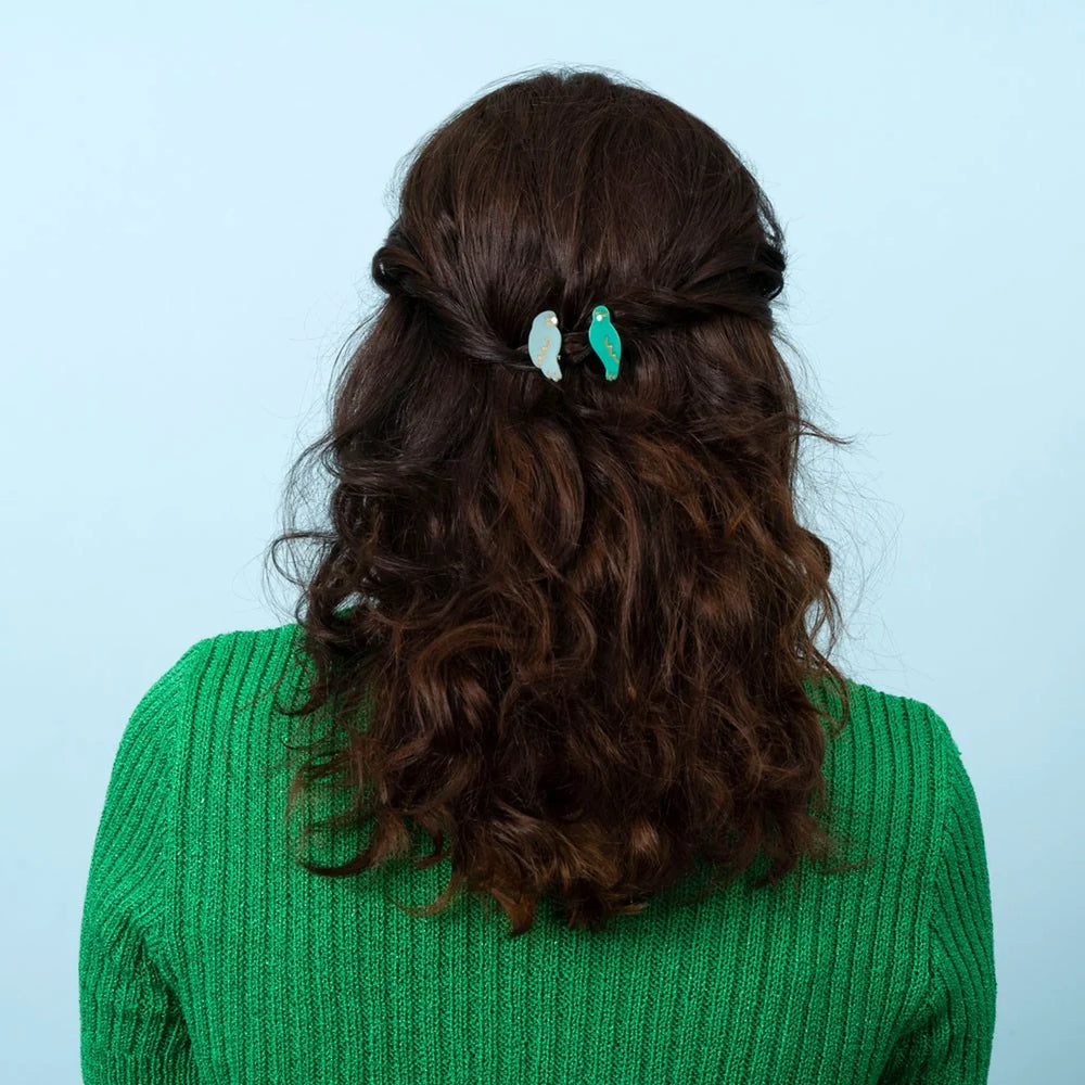 Set od dvije kopče za kosu u obliku zaljubljenih ptičica, u plavoj i zelenoj boji. Jer za ljubav je potrebno dvoje!